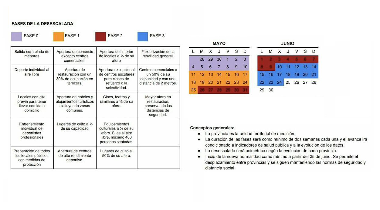 El texto que se ha trabajado en el Consejo de Ministros se divide como una especie de gran cuadro de actividades —laborales, personales, culturales, deportivas, turísticas, de culto— y explica con detalle qué se podrá hacer en cada una de esas fases y los cambios que supone cada salto, pero no cuándo llegarán estos cambios de fase. Puedes ver el Plan completo aquí.